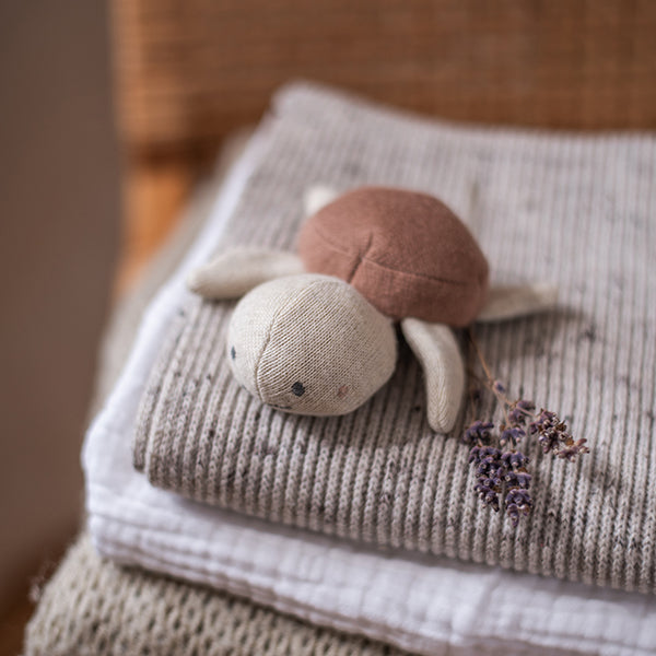 Unsere knuffigen kleinen Schildkrötenrasseln sind aus weicher Bio-Baumwolle gefertigt.