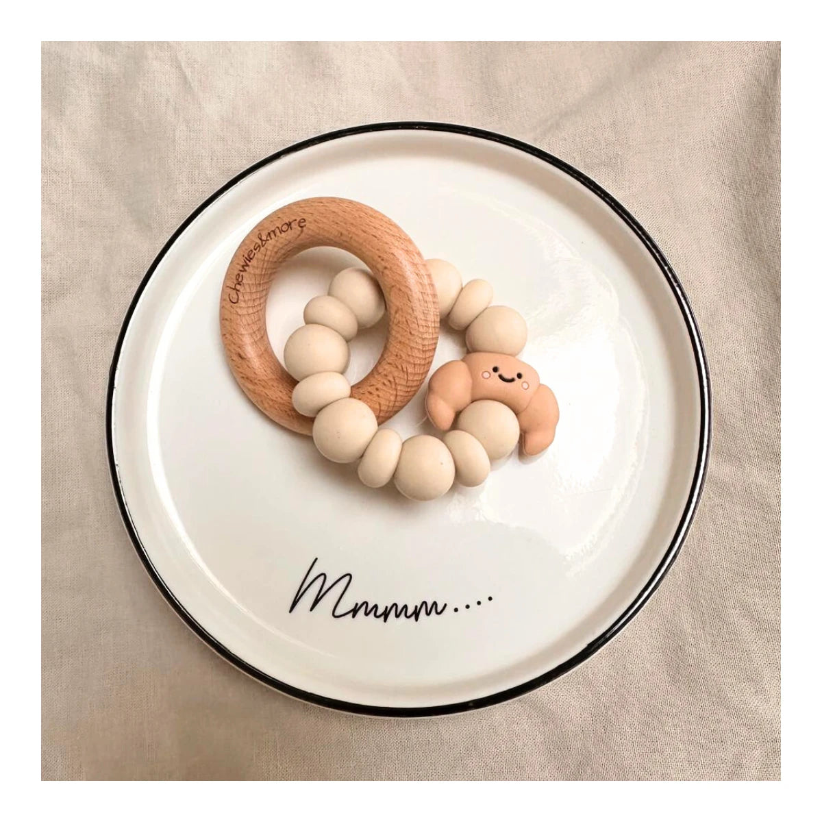 Dieser Croissant Beißring ist eine gute Basis für die Kleinsten. Durch die runde Größe sind sie leicht zu halten. Die Kontraste und Texturen der Perlen machen es für das Baby noch interessanter. Dieser Chewie massiert das empfindliche Zahnfleisch und lindert den Schmerz beim Zahnen durch die Verwendung von elastischem Silikon und unbehandelten Bio-Buchenholzperlen.