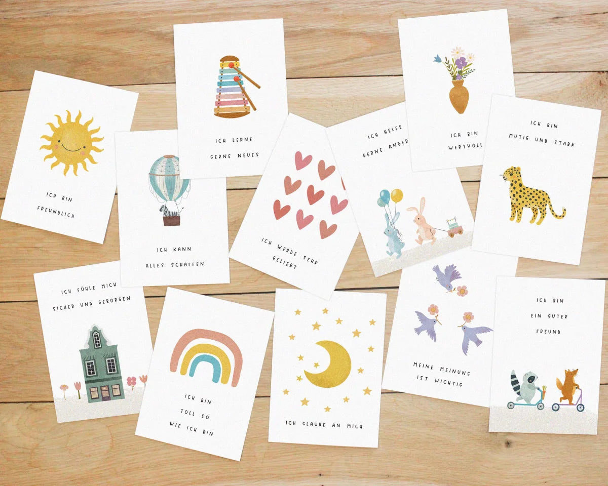 12 wunderschöne Affirmationskarten für Kinder im DIN A6 Format