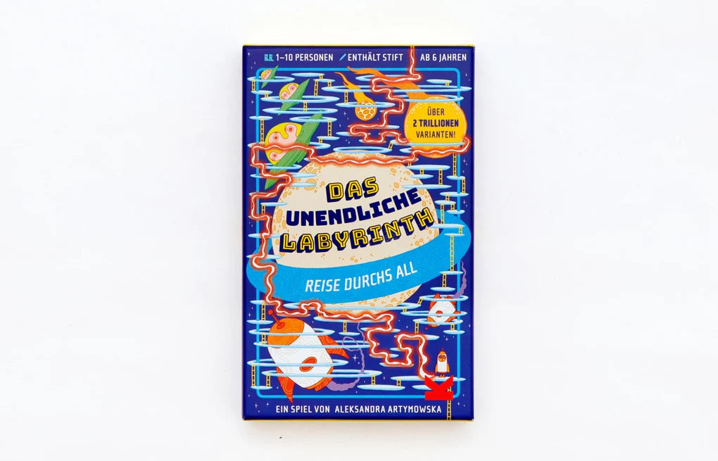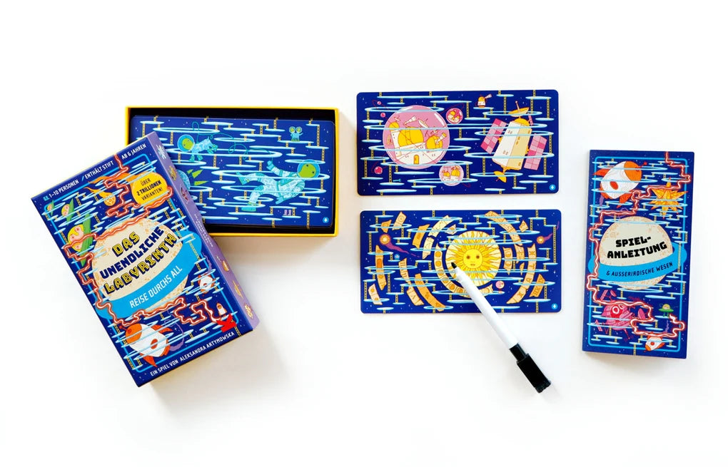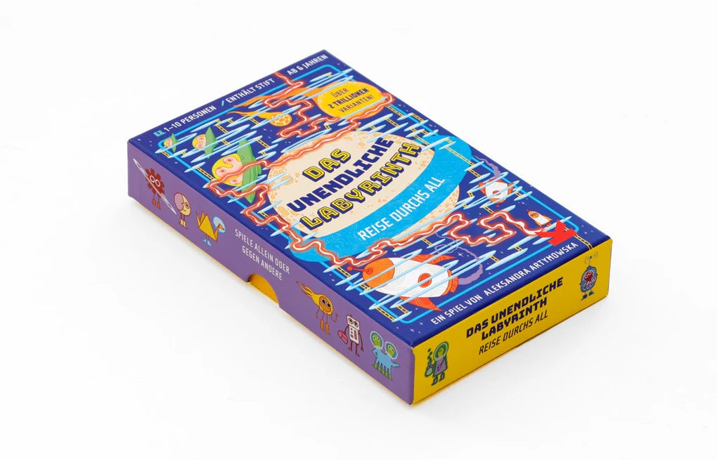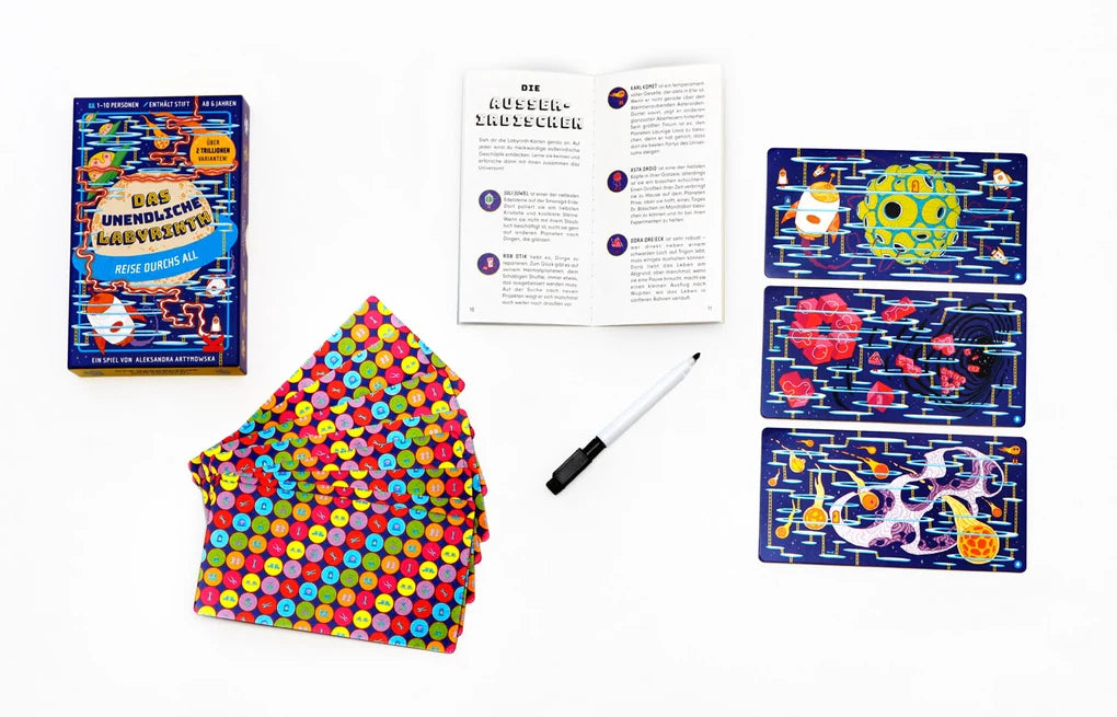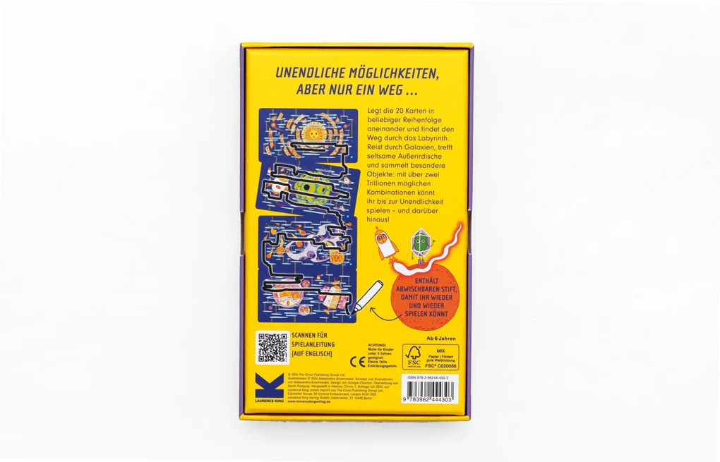 Wer findet am schnellsten den Weg durch Das unendliche Labyrinth? Diese 20 Labyrinth-Karten können in über 2 Trillionen verschiedenen Kombinationen zusammengesetzt werden. Aber es gibt immer nur einen einzigen Weg, der vom Start zum Ziel führt! Ihr wählt eine Spielfigur und helft ihr, schneller als alle anderen nach Hause zu finden und dabei besondere Gegenstände einzusammeln, die euch einen Vorsprung verschaffen ko?nnen. Oder ihr spielt allein und lauft durch ein insgesamt 170 cm langes Labyrinth. Macht euch bereit für eine aufregende Reise quer durchs Universum!