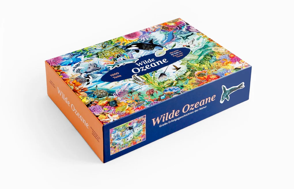 Es enthält 20 Teile in der Form von Tieren, die mit den anderen herkömmlichen Puzzleteilen zusammengesetzt werden können. Außerdem enthalten ist ein großes Poster, das acht bemerkenswerte Erfolgsgeschichten der Natur darüber erzählt, wie bedrohte Arten sich ihre Lebensräume zurück- oder neue erobern. Dieses Puzzle zeigt die wundervolle, farbenfrohe Welt in unseren Ozeanen und berichtet davon, wie sich Arten und Lebensräume erholen können, wenn wir sie lassen.