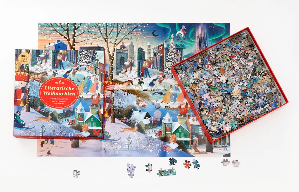 Verbringt Weihnachten mit Charles Dickens, den Gebrüdern Grimm, Jane Austen und Tolstoi - um nur einige der hier vertretenen Autor*innen großer Weihnachtsklassiker zu nennen! Mit diesem 1000-teiligen Puzzle setzt ihr berühmte Weihnachtsszenen und Figuren aus der Weltliteratur zusammen. Trefft Scrooge in Londons Straßen, macht eine winterliche Kutschenfahrt mit Emma, oder lasst euch von der Schneekönigin verzaubern - hier ist fu?r die ganze Familie was dabei!