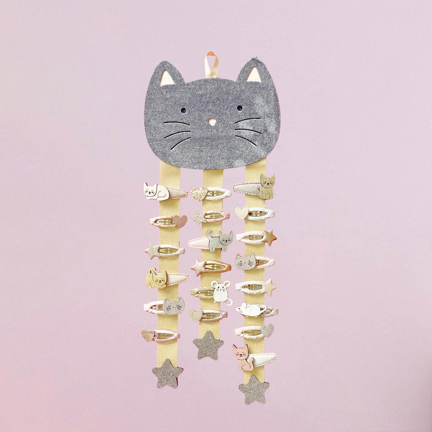Endlich Ordnung für alle Haarspangen – und das in der wohl süßesten Form überhaupt! Der Kätzchen-Wandaufhänger von Mimi & Lula ist aus weichem Samt und glitzerndem Stoff gefertigt und begeistert mit liebevoll gestickten Details. An den hübschen Satinbändern mit glitzernden Sternen lassen sich Haarclips, Spangen und kleine Accessoires perfekt aufbewahren. So sind Lieblingsstücke jederzeit griffbereit und werden zugleich dekorativ präsentiert.