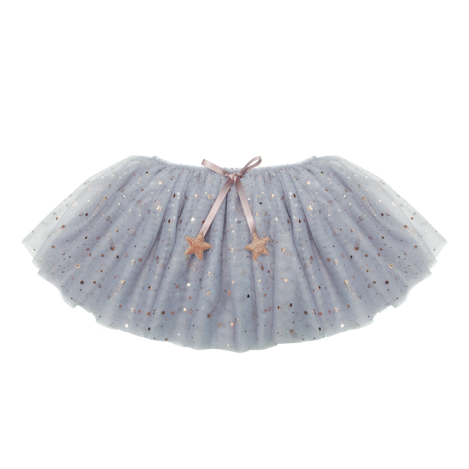 - Layers of super soft grey tulle embellished with constellations of rose gold stars, featuring a satin bow with rose gold glitter star charms