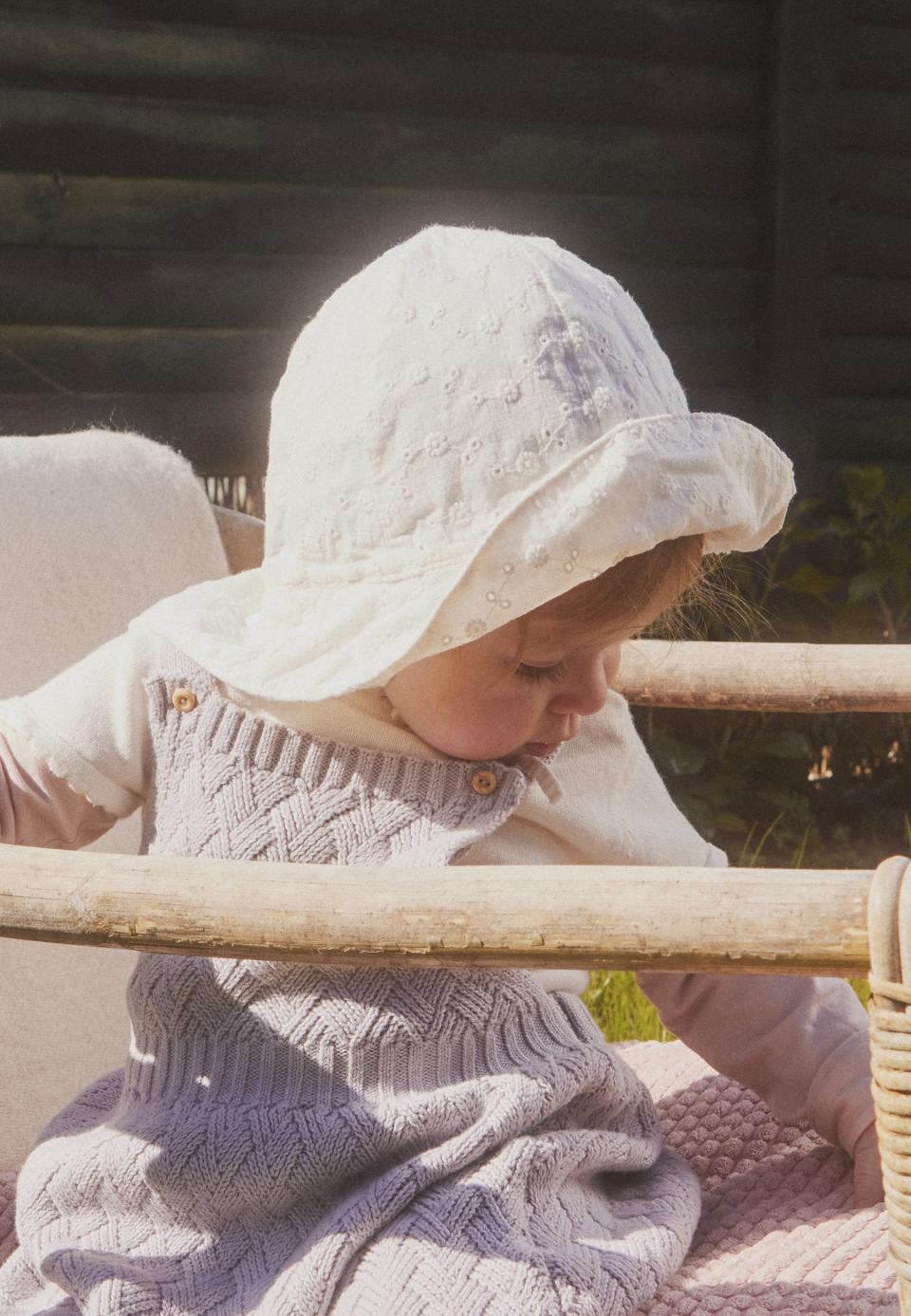 Beautiful 100% cotton summer hat by mpKids decorated with delicate flower embroidery. The neck shade provides sun-protection for the child’s neck. The soft ties under the chin ensure that the hat stays in place.