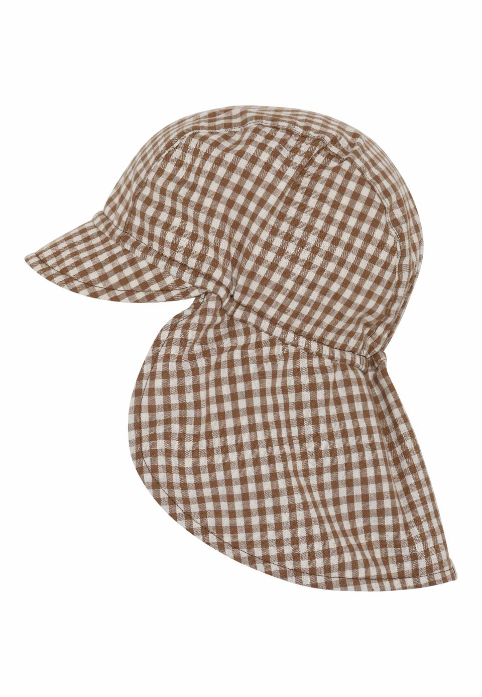 Beautiful legionary hat in 100% cotton with a long brim at the neck and a short brim at the front. The sewn-in elastic in the neck and side helps to ensure a good fit and the cotton tie under the chin helps to keep the sun hat in place. The sun hat has a UV30+ factor and thus protects the child's face and head from the sun's dangerous rays.