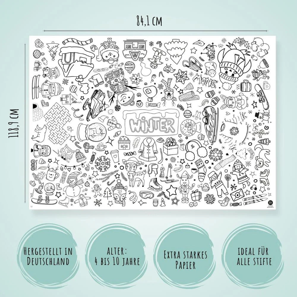 Ideal für Kindergeburtstage, Nachmittage mit Freunden und Familien oder an kalten Regentagen – auf unserer Maldecke kannst du fleißig entdecken und ausmalen. Unsere Winterwelt wartet darauf von dir kunterbunt bemalt zu werden.